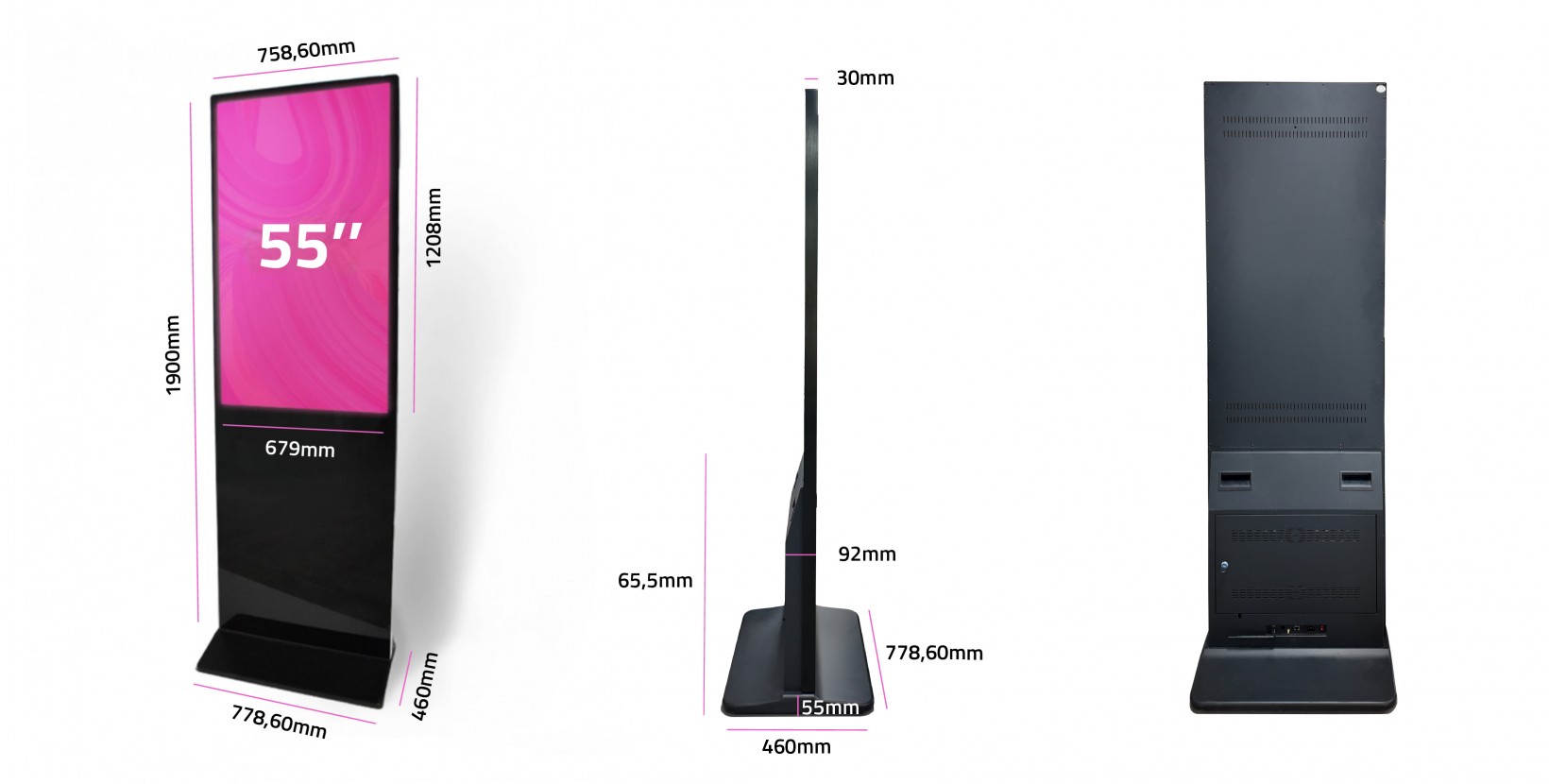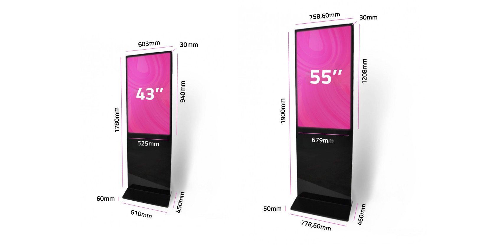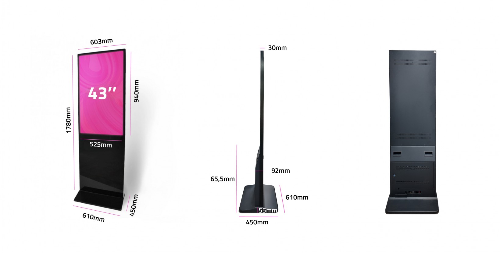 Mupi numérique disponible en différentes tailles Full HD. Conçu pour projeter des vidéos publicitaires sur des points de vente dans de grands espaces intérieurs. Connexion USB et WiFi avec possibilité de publier des vidéos à distance. 43 ou 55 pouces 300 bougies, connexion réseau, USB et WiFi. Dimensions : 18 cm d'épaisseur x 197 cm de hauteur, 80 cm de largeur. La meilleure option qualité-prix pour les vitrines d'intérieur.