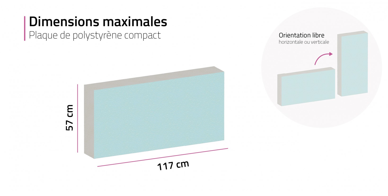 La plaque de polystyrène extrudé une surface utile de 117 x 57 cm, quelle que soit l'orientation.