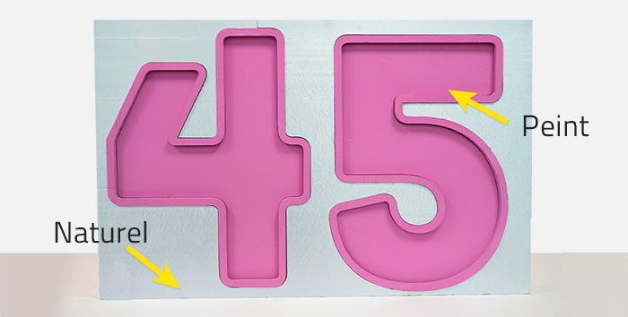Note : Les lettres telles que le "A" ou le "e" présentent une petite rainure dans les parties intérieures pour leur découpe. Dans la version peinte, cette rainure est comblée et repeinte pour une finition uniforme.