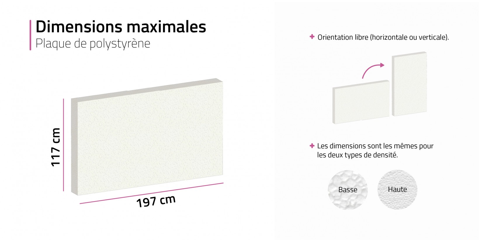 La taille de la plaque est de 200x120 cm, avec une surface utile de 197x117 cm, quelle que soit l'orientation.