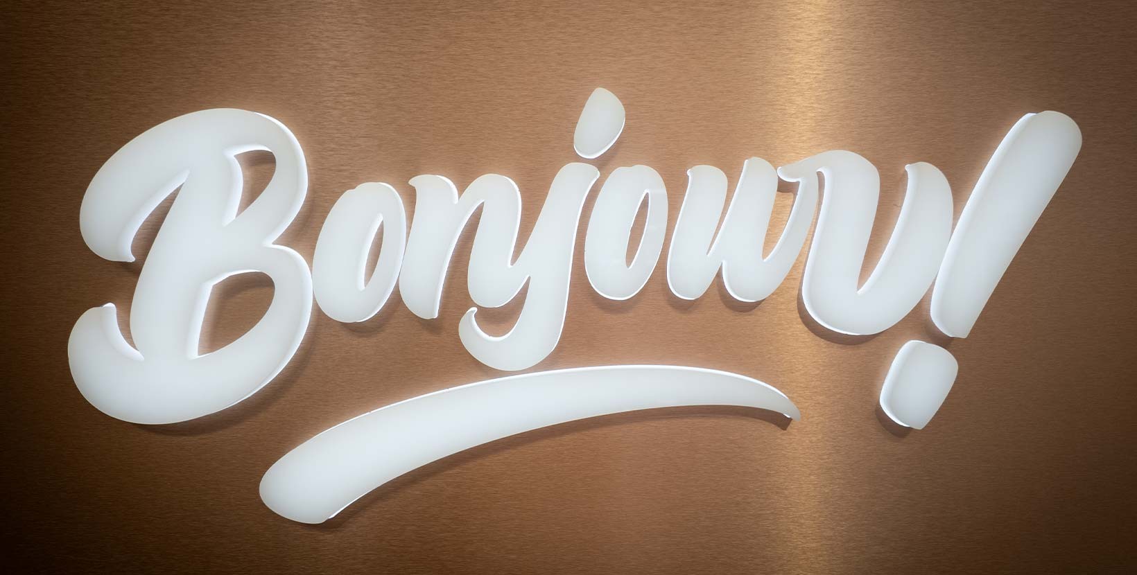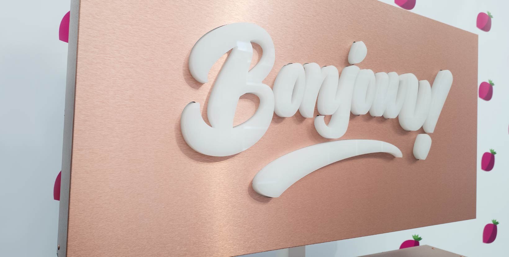 Une option consiste à utiliser des lettres blanc opale en relief pour le texte. Cela donne plus de profondeur au plateau en Dibond.