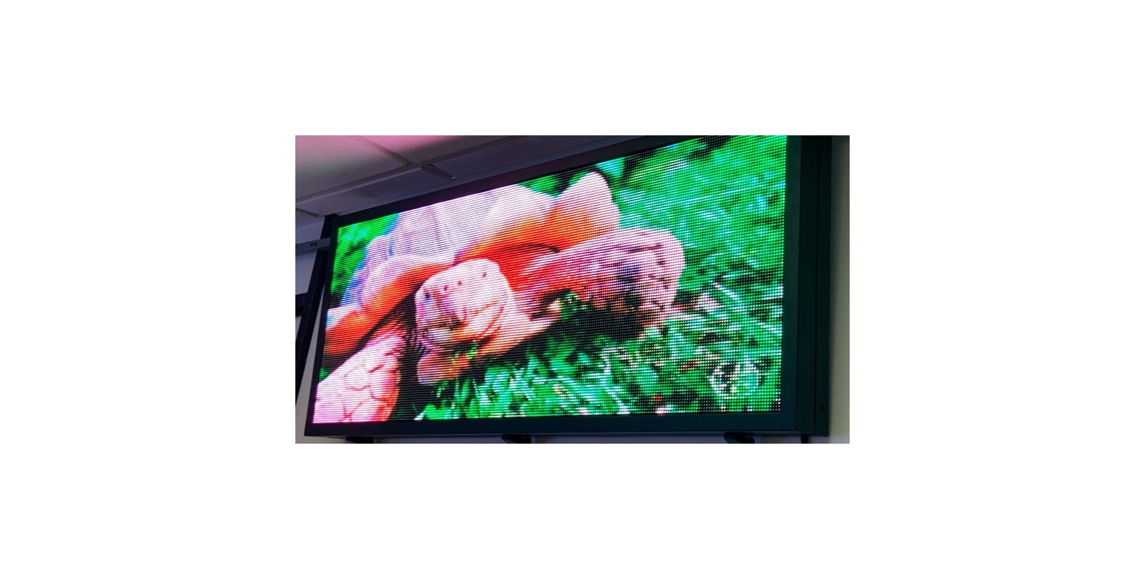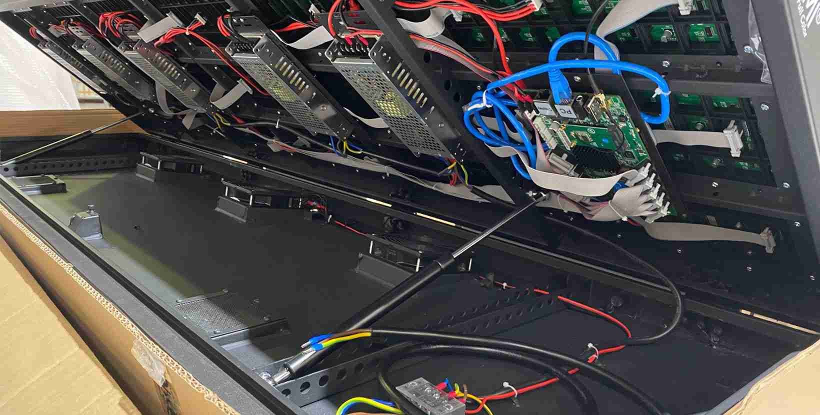 Affiche LED extérieure programmable x19 P5 polychrome. Cette affiche a une résolution de 256 x 96 px par stand avec une luminosité de 5 000/5 500 nits. INCLUS : modules, blocs d'alimentation, câbles d'alimentation, câble de données, vis, carte, boîtier extérieur, 1 répétition.