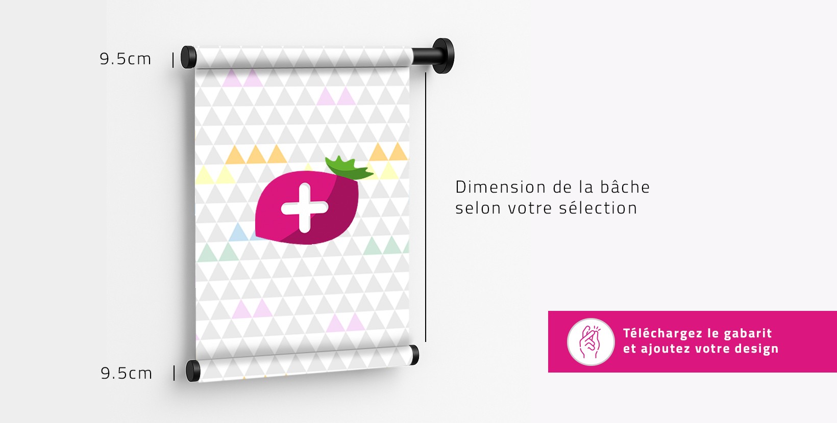 Si vous choisissez une bâche de 50 cm de hauteur visible, le fichier final mesurera 69 cm de hauteur totale (50 cm visibles + 9,5 cm en haut + 9,5 cm en bas).