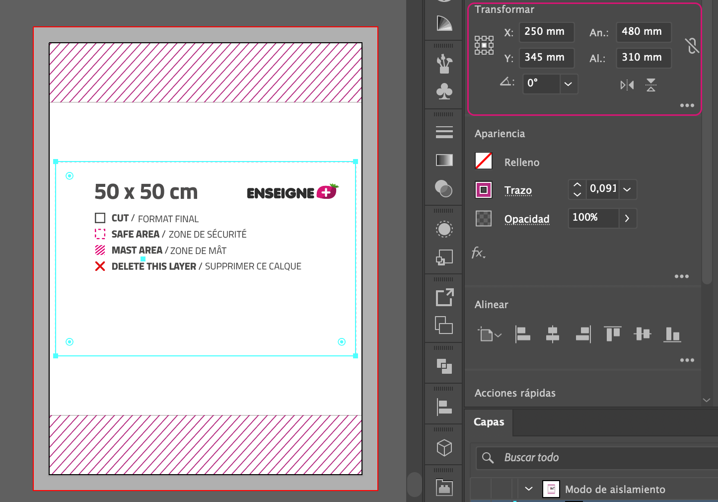 Attention, les dimensions sélectionnées ne correspondent pas à la taille totale de l’impression (voir capture d’écran).