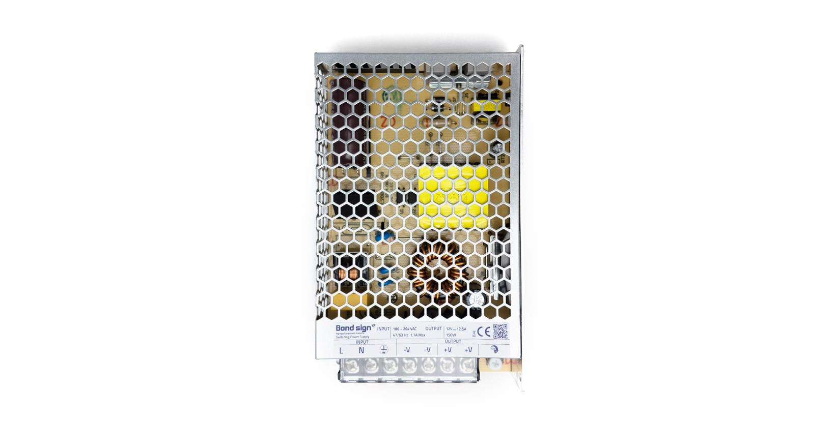 L’alimentation modèle BOND SIGN ELDV-12E150T fournit une puissance continue de 150 W avec une sortie stable de 12 V DC / 12,5 A, pour une entrée secteur comprise entre 180 et 264 VAC.