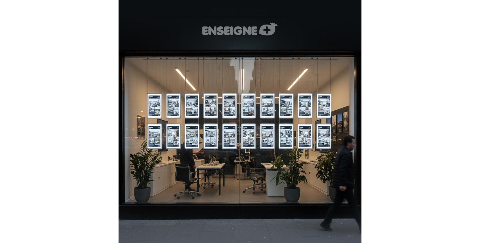 Enfin, nous tenons à souligner que ce modèle de vitrine n'est pas uniquement destiné aux agences immobilières, ce modèle de vitrine offre un grand nombre de possibilités pour différents types d'entreprises qui souhaitent proposer leurs produits en vitrine, agences de voyages, concessionnaires automobiles, banques, etc. Quels que soient les besoins de votre entreprise et la façon dont vous avez choisi de communiquer vos offres en Enseigne Plus nous avons des solutions pour répondre à vos besoins, n'hésitez pas à nous contacter.