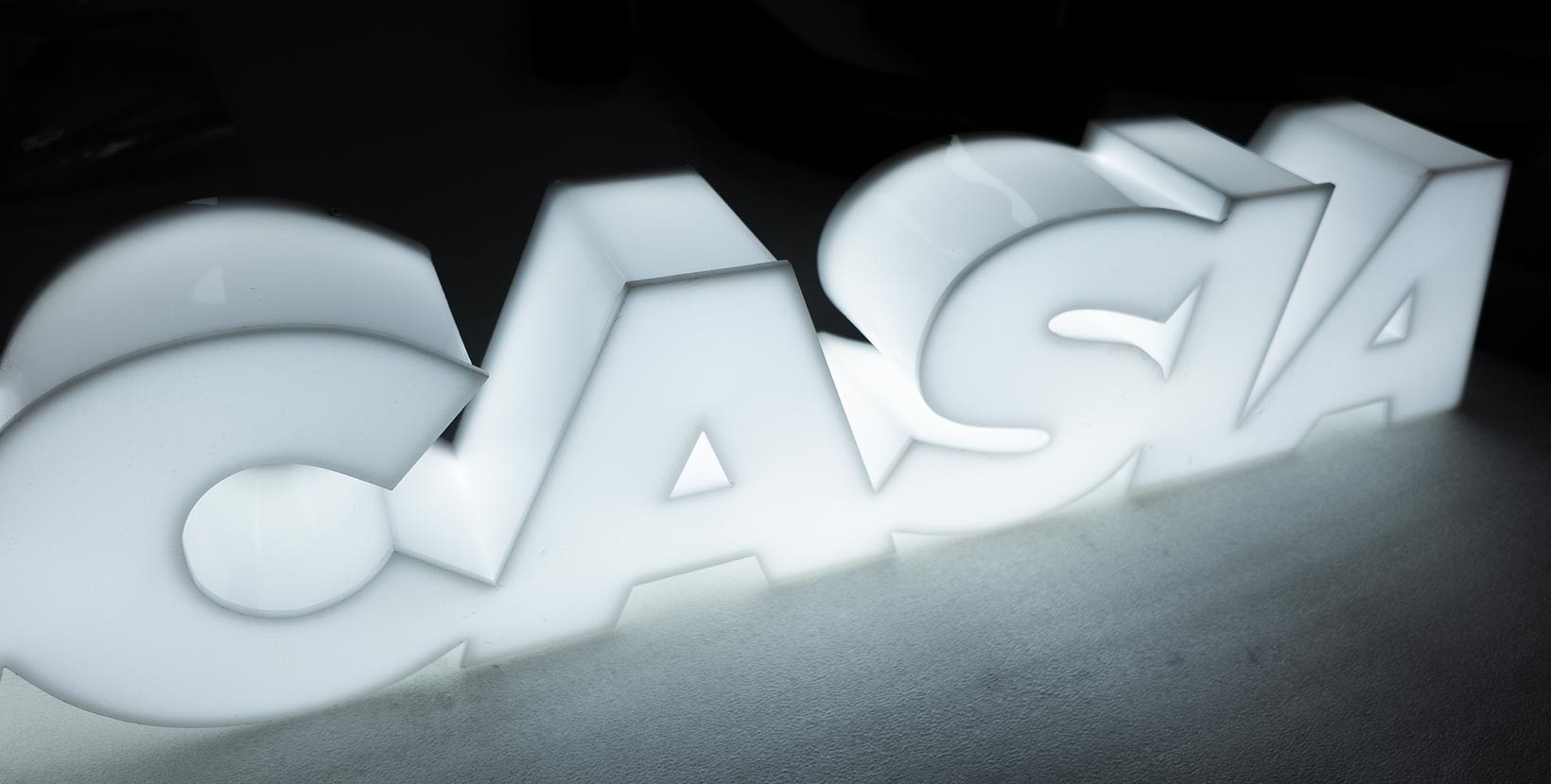 Lettres lumineuses en relief fabriquées entièrement en plexiglas, avec une face et des côtés découpés individuellement, puis assemblés par soudure. Elles reposent sur une base en PVC de 10 mm, sur laquelle est intégré tout le système électrique.
