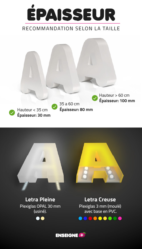 Pour les lettres de 35 à 60 cm de haut, nous recommandons une épaisseur de 80 mm.
